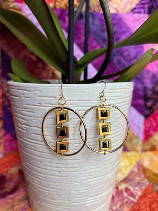 Earrings- Gold plated metal hoops with squares and black cube seed beads.
