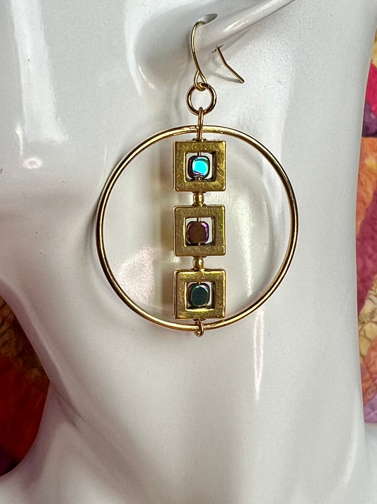 Earrings- Gold plated metal hoops with squares and metallic rainbow hematite cube seed beads.
