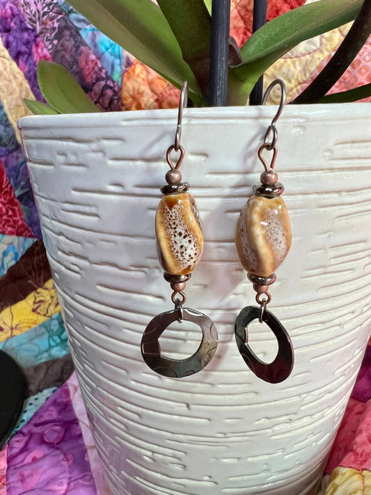 Earrings- Copper and gunmetal plated metal with tan and brown speckled ceramic center bead.