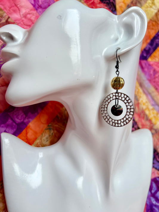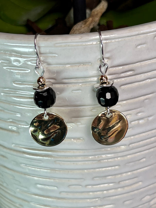 Earrings- Gold and silver plated metal with opaque black crystal beads.
