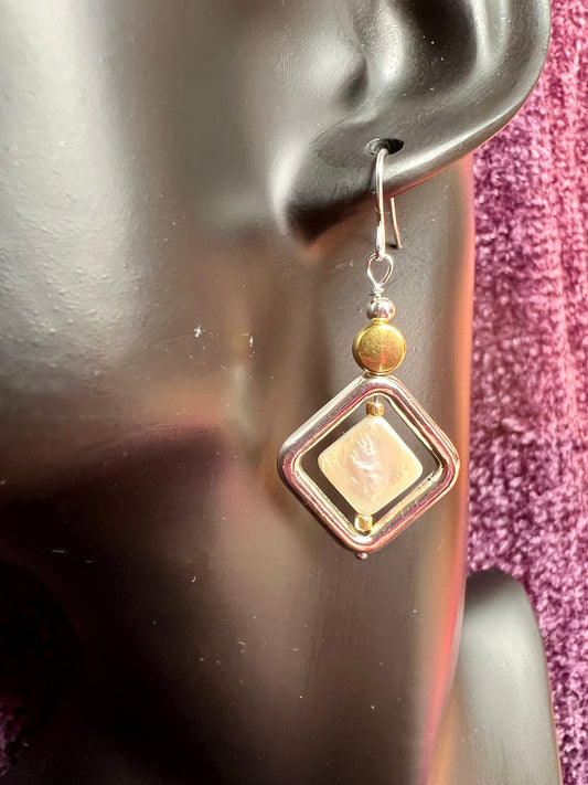 Earrings- Gold and silver and antiqued silver plated metal white iridescent diamond shaped freshwater pearls.