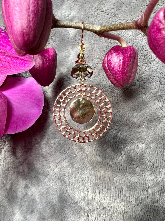 Earrings- Copper and gold plated metal and a clear crystal with a gold stripe in the center.