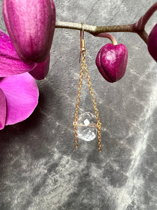 Earrings- Gold plated metal and chain with large clear crystals dangling on the bottom.
