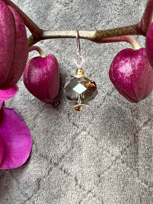 Earrings- Gold and silver plated metal with a crystal that has a unique luster.