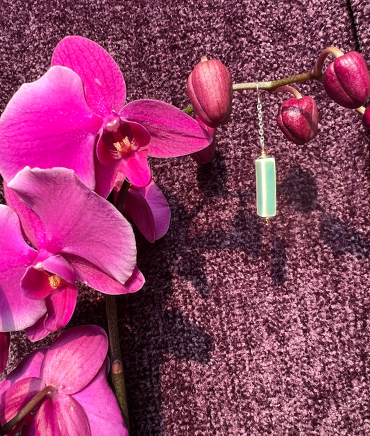 Earrings- Silver plated metal and gold plated round beads. Ceramic rectangular tube beads with a sea foam green glaze.