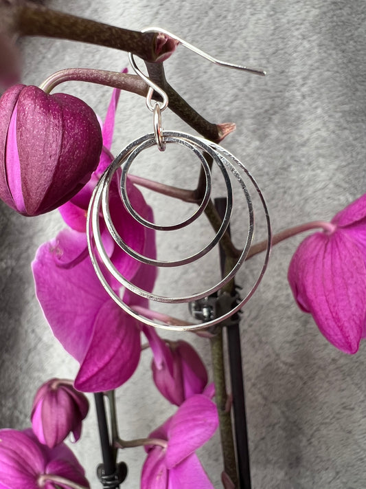 Earrings- Silver plated metal hoops and black plated wires with iridescent coin crystals.