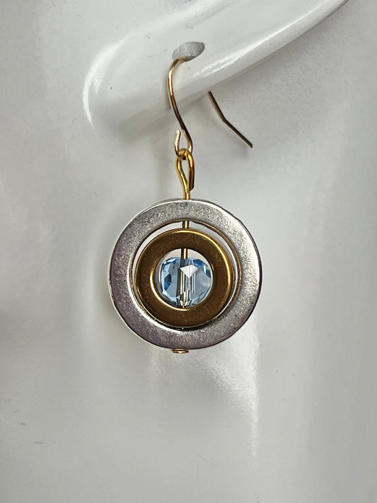 Earrings- Silver plated hoops outside gold plated hoops with blue crystal in center.
