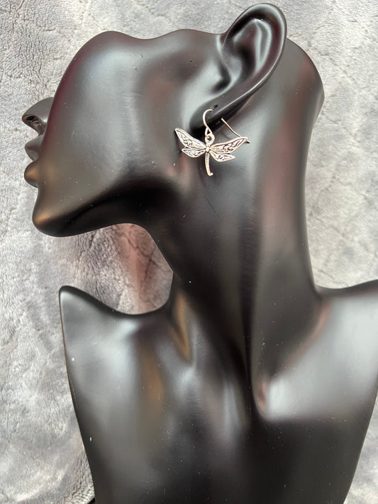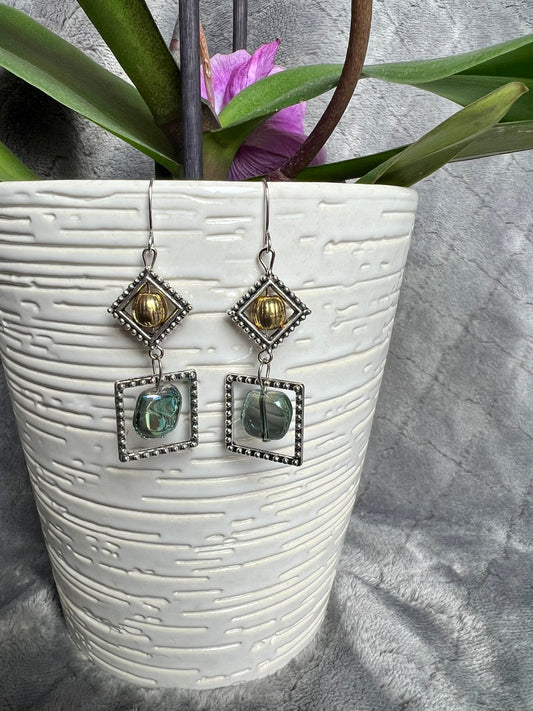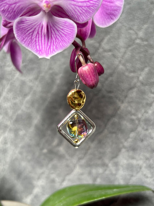 Earrings- Silver plated hooks, diamond shaped window bead, and rainbow coated pressed glass.