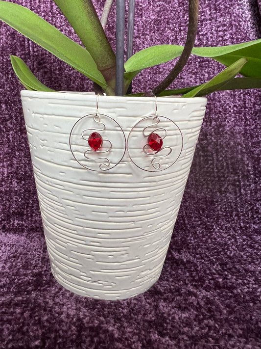 Earrings- Silver plated hoop with wire scroll design and red crystal.