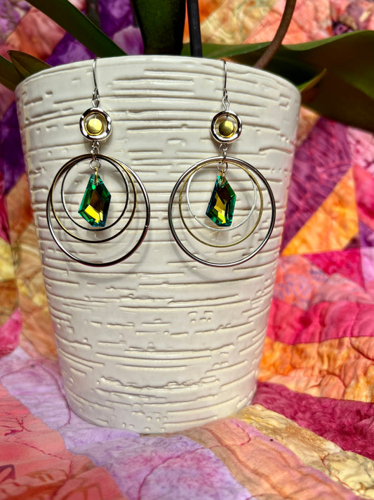 Earrings- Silver plated Hooks with hoops and geometric green/yellow crystal dangle.