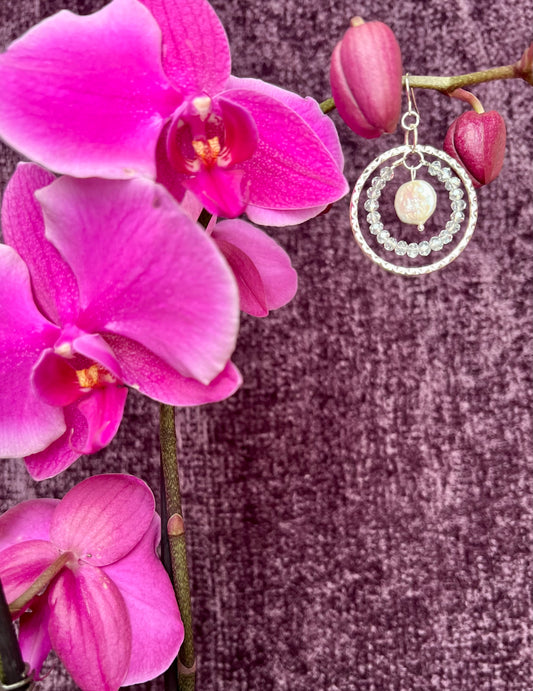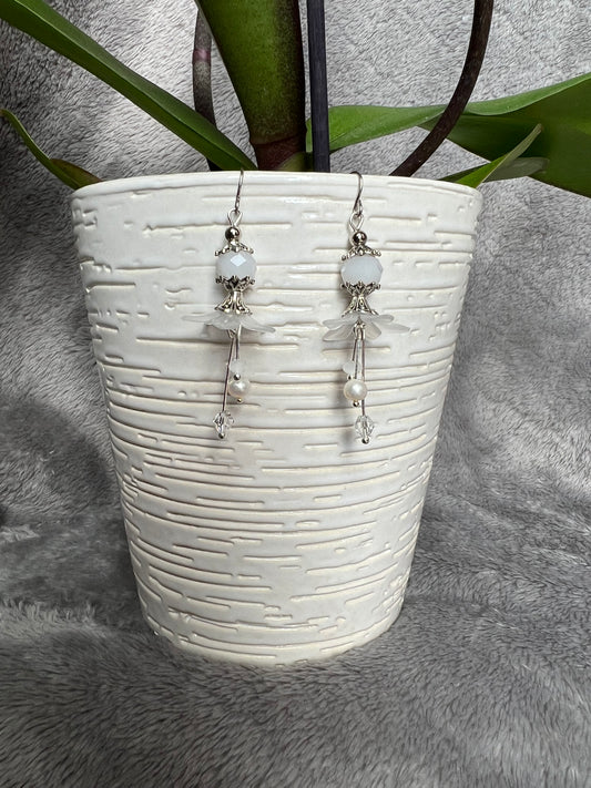 Earrings- Silver plated metal with fresh water pearls, crystals, and white acrylic flowers.