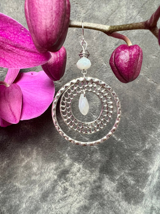 Earrings- Silver plated metal with natural stone beads on top of antiqued silver plated hoops.