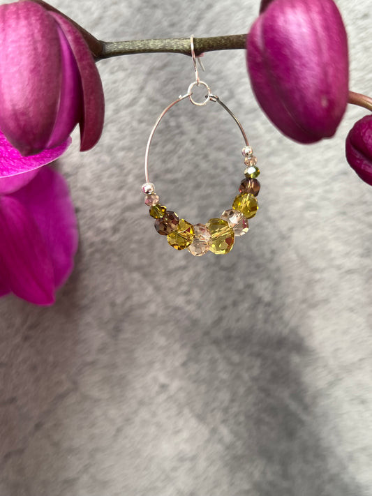 Earrings- Silver plated metal with cream, smoky quartz, & olive green crystal beads.