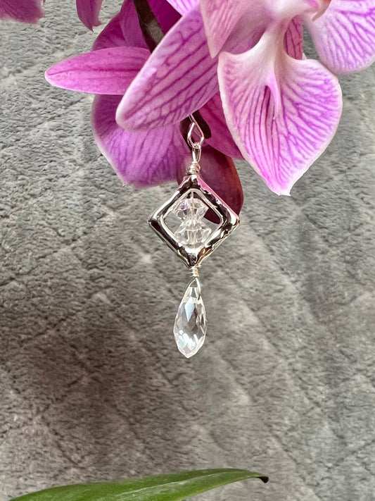 Earrings- Silver plated metal with diamond shaped bead frames and clear crystals.