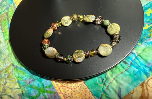 Bracelet- Antique gold, jasper, crystals, and smoky quartz.