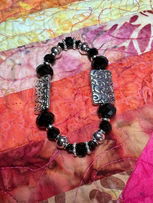 Bracelet- Silver plated metal beads with opaque black crystals.