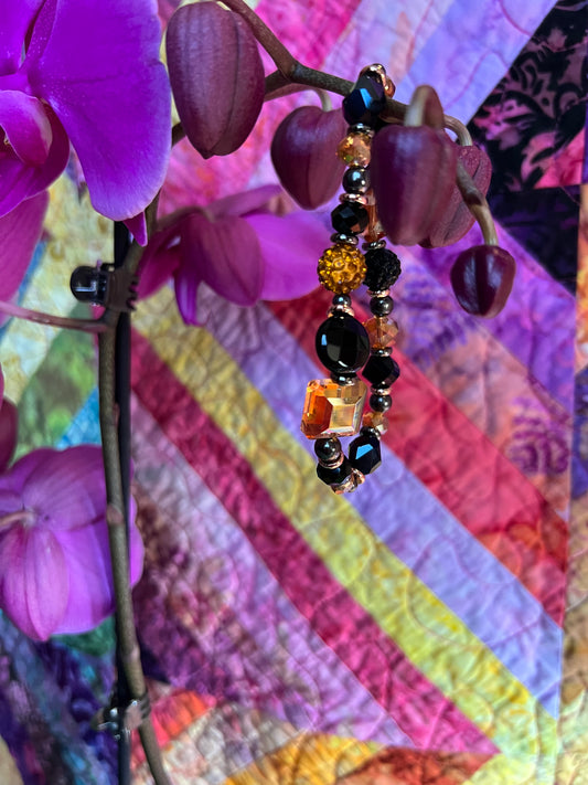 Bracelet- Opaque black crystal, gunmetal & copper plated metal beads, & iridescent orange crystals.