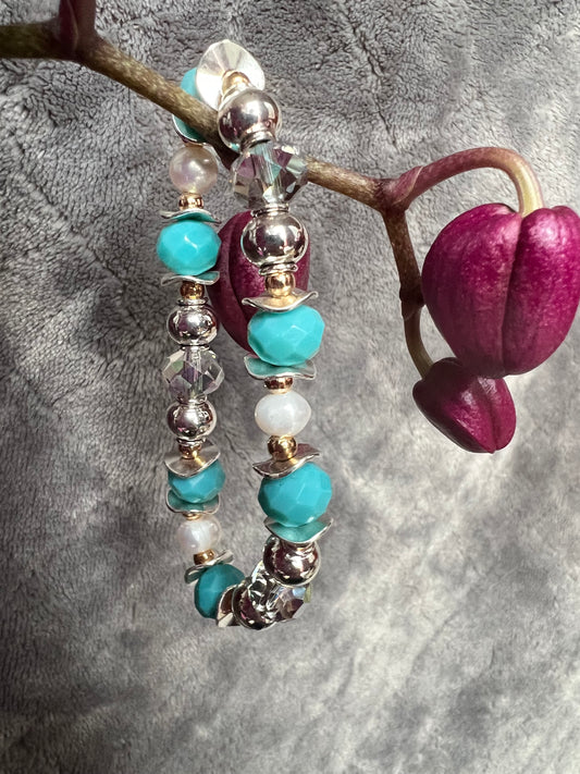 Bracelet- Gold and silver plated metal beads, crystals, & freshwater pearls.