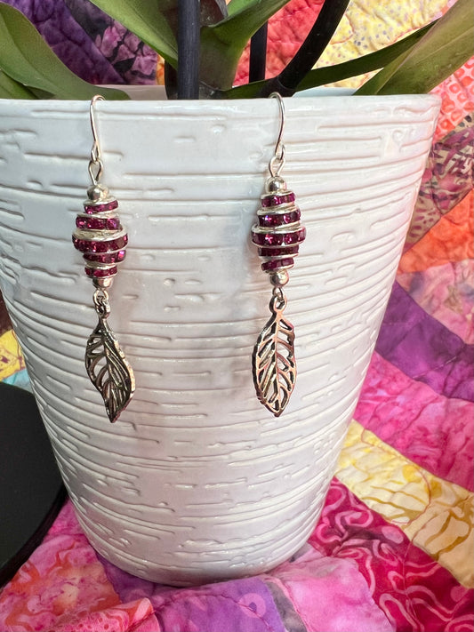 Earrings- Silver plated metal leaves with fuchsia colored crystal rondelles.