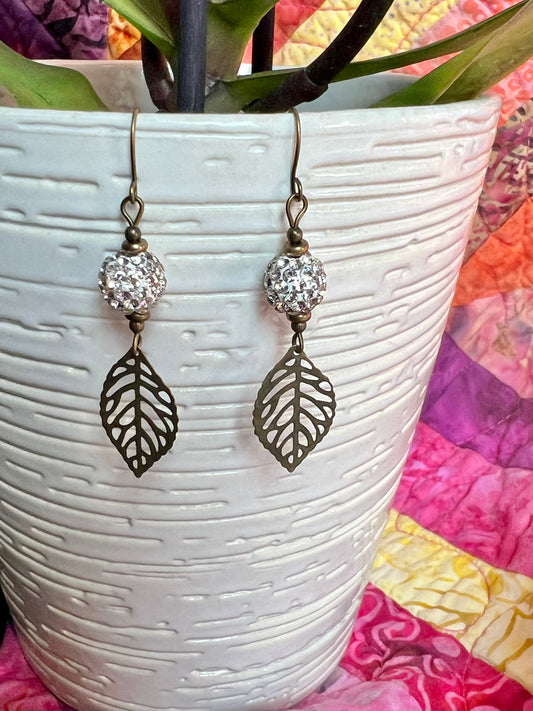 Earrings- Antique gold plated metal leaves with polymer clay beads with clear crystal rhinestones.