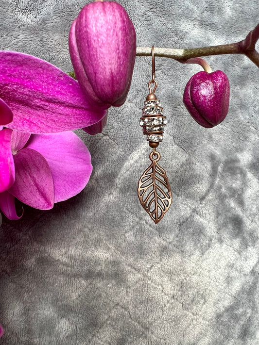 Earrings- Antique copper plated metal leaves with clear crystal rondelles.