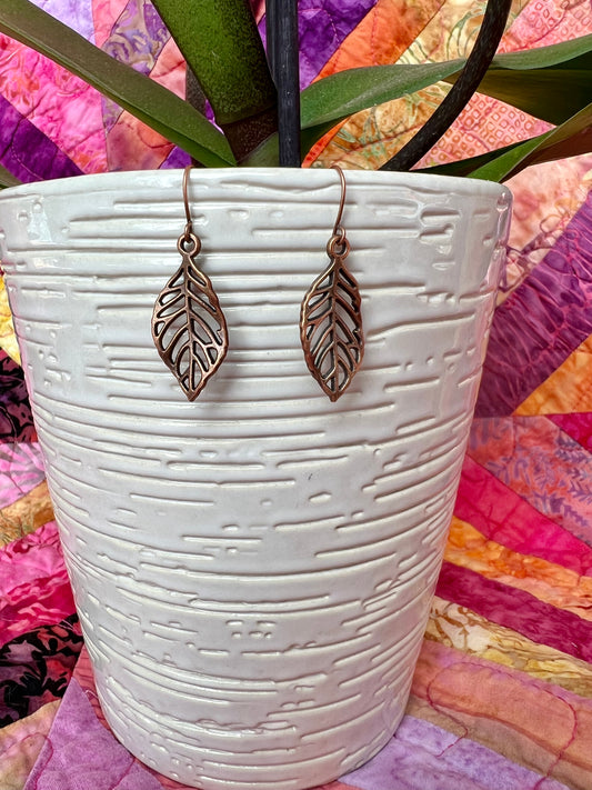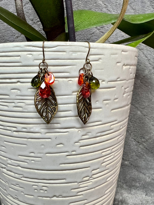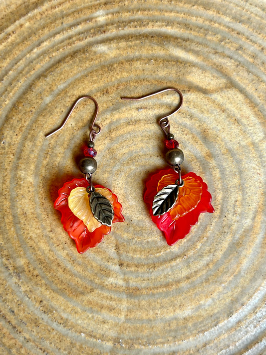 Earrings- Antique copper plated ear wires, antique gold leaf charms, red and orange lucite leaves.