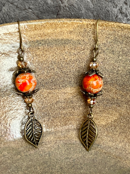 Earrings- Antique gold plated ear wires and metal leaves, small yellow orange crystal beads and natural dyed stone round beads.