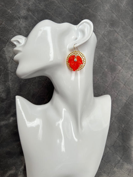 Earrings- Acrylic orange and red leaves with gold plated metal circle hoops and AB crystals.