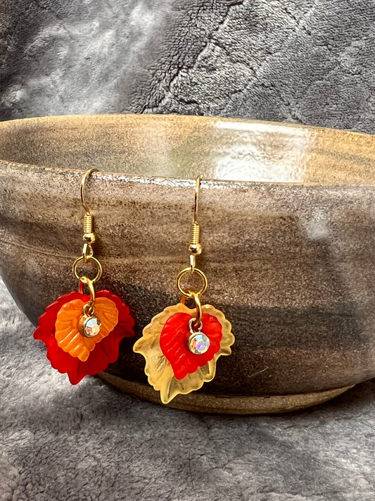 Earrings- Acrylic orange and red leaves with gold plated metal and AB crystals.