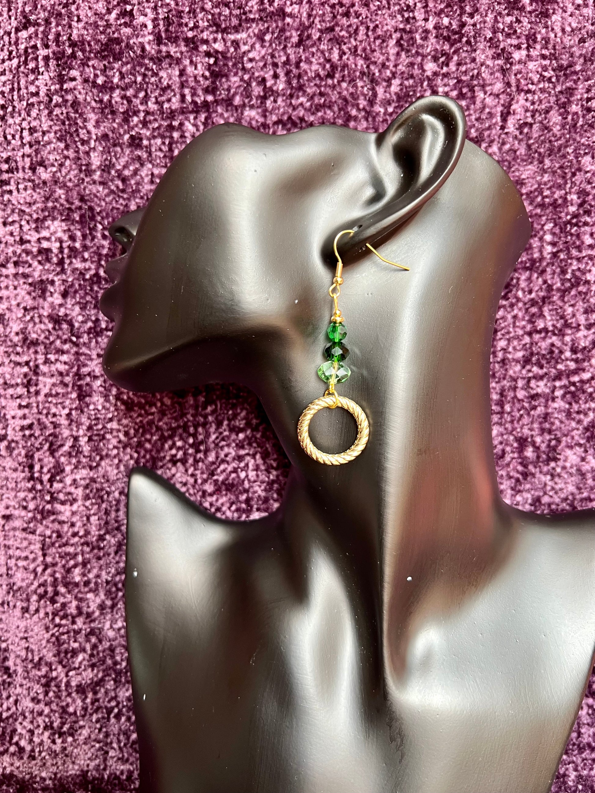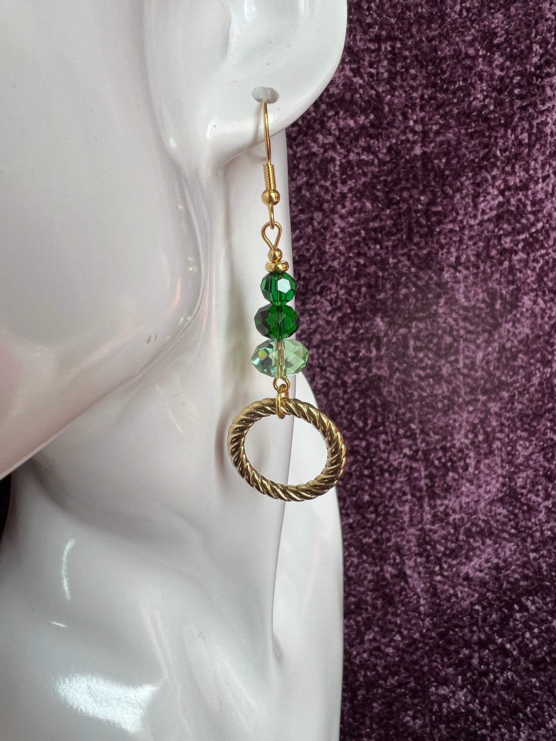 Earrings- Gold plated stainless steel ear hooks, gold plated metal with various green colored crystals.