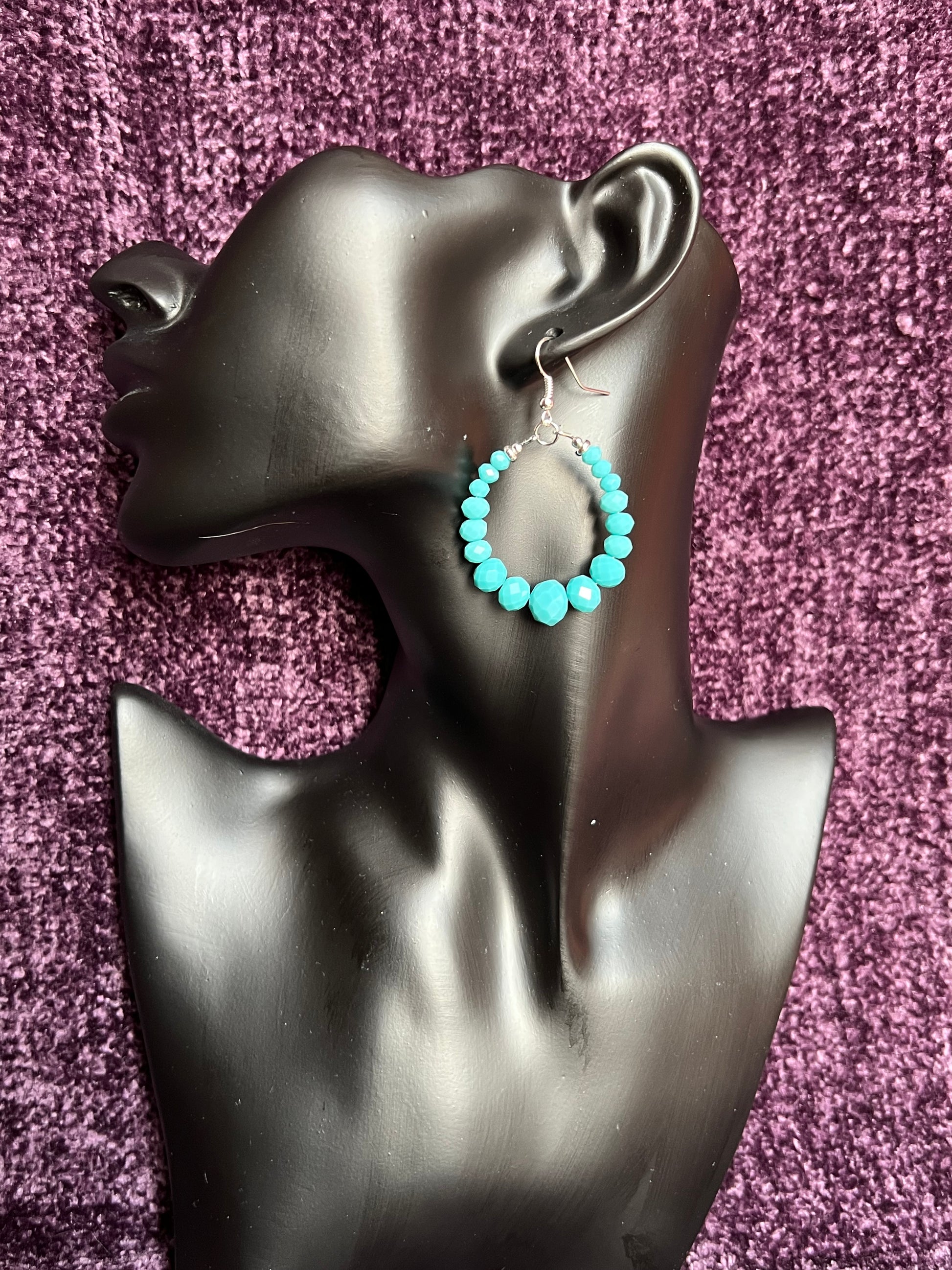 Earrings- Silver plated metal hoops with opaque turquoise colored crystals.