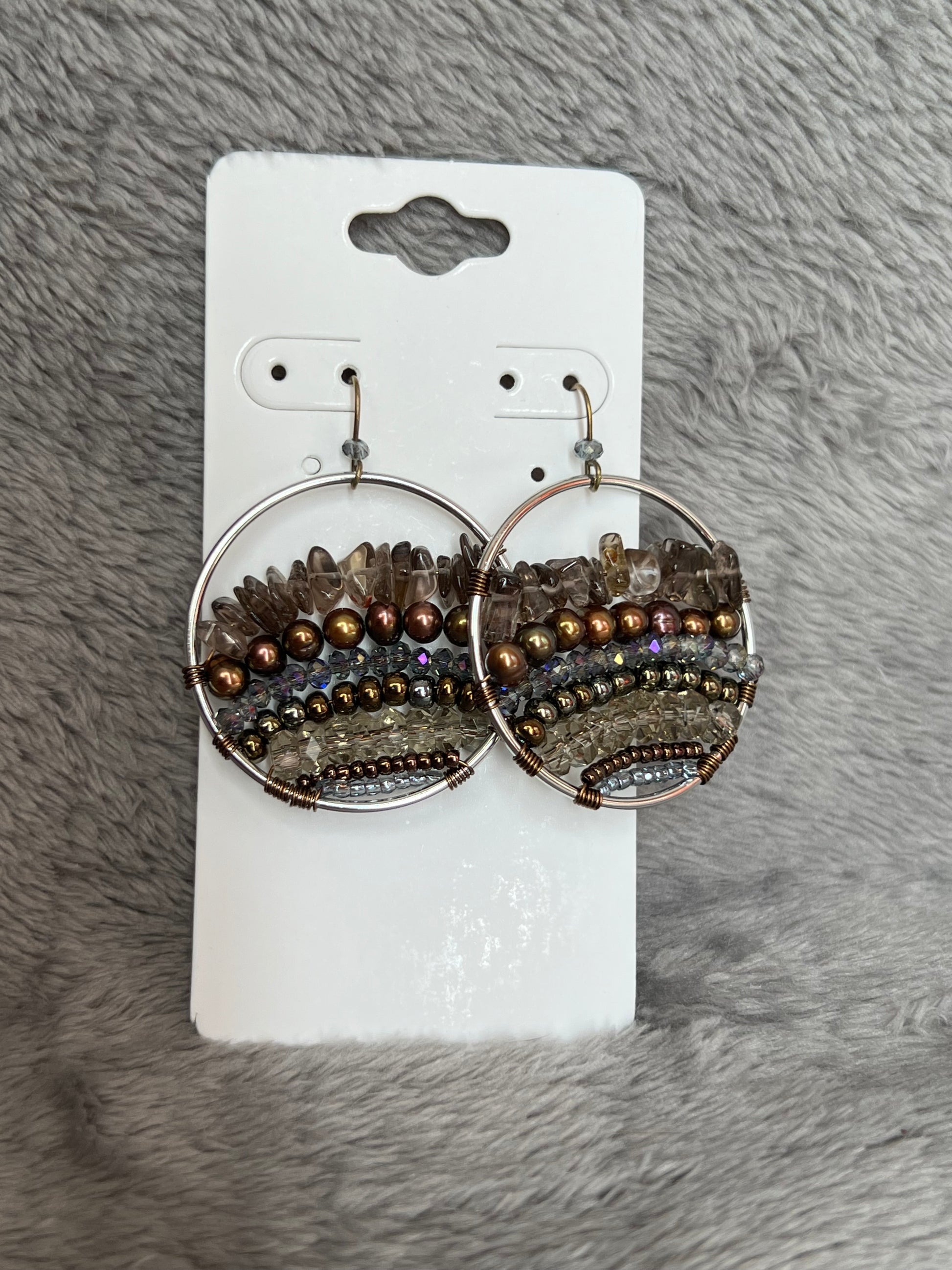 Earrings- Silver plated metal with Smokey quartz, fresh water pearls and crystals.