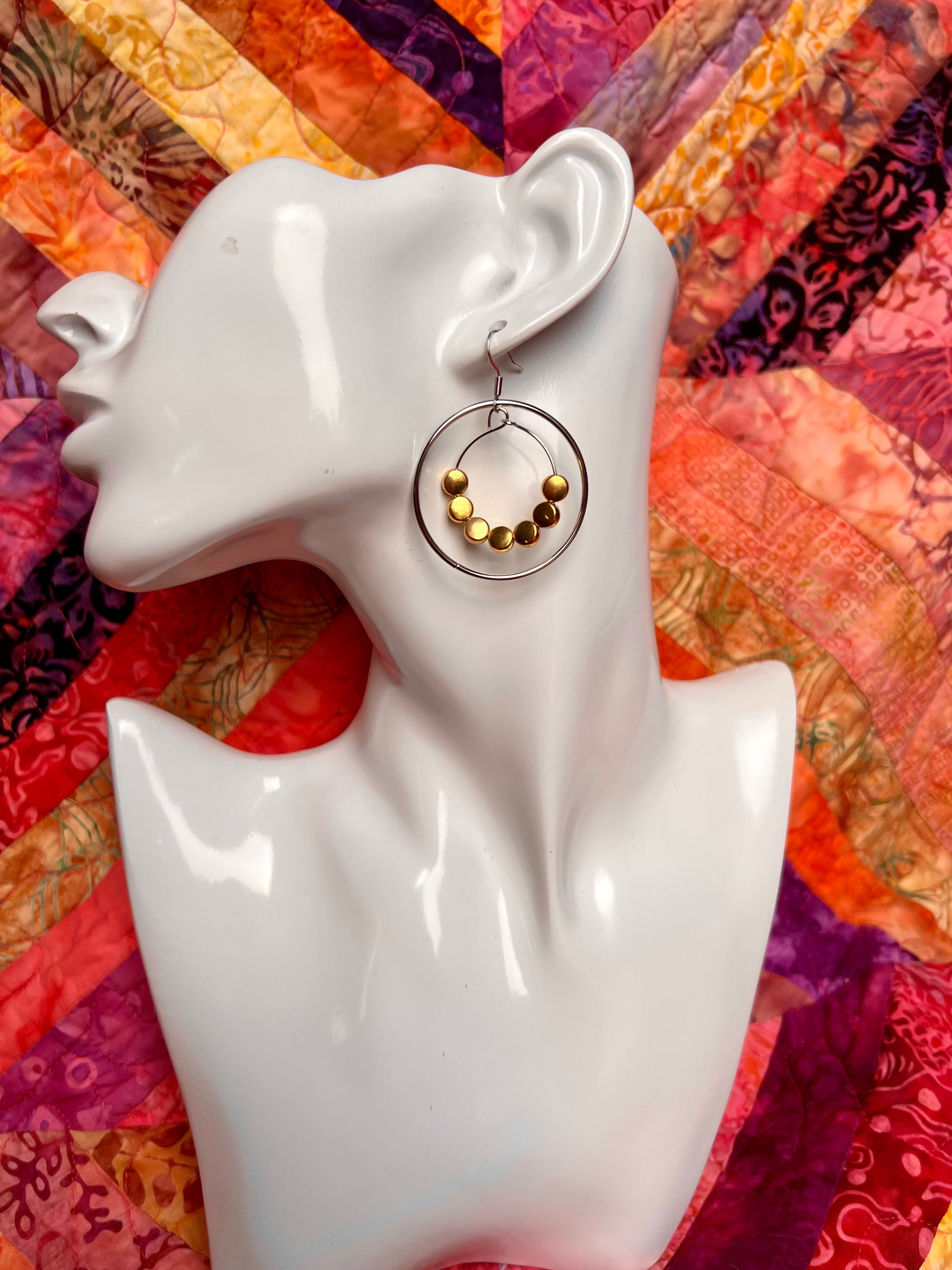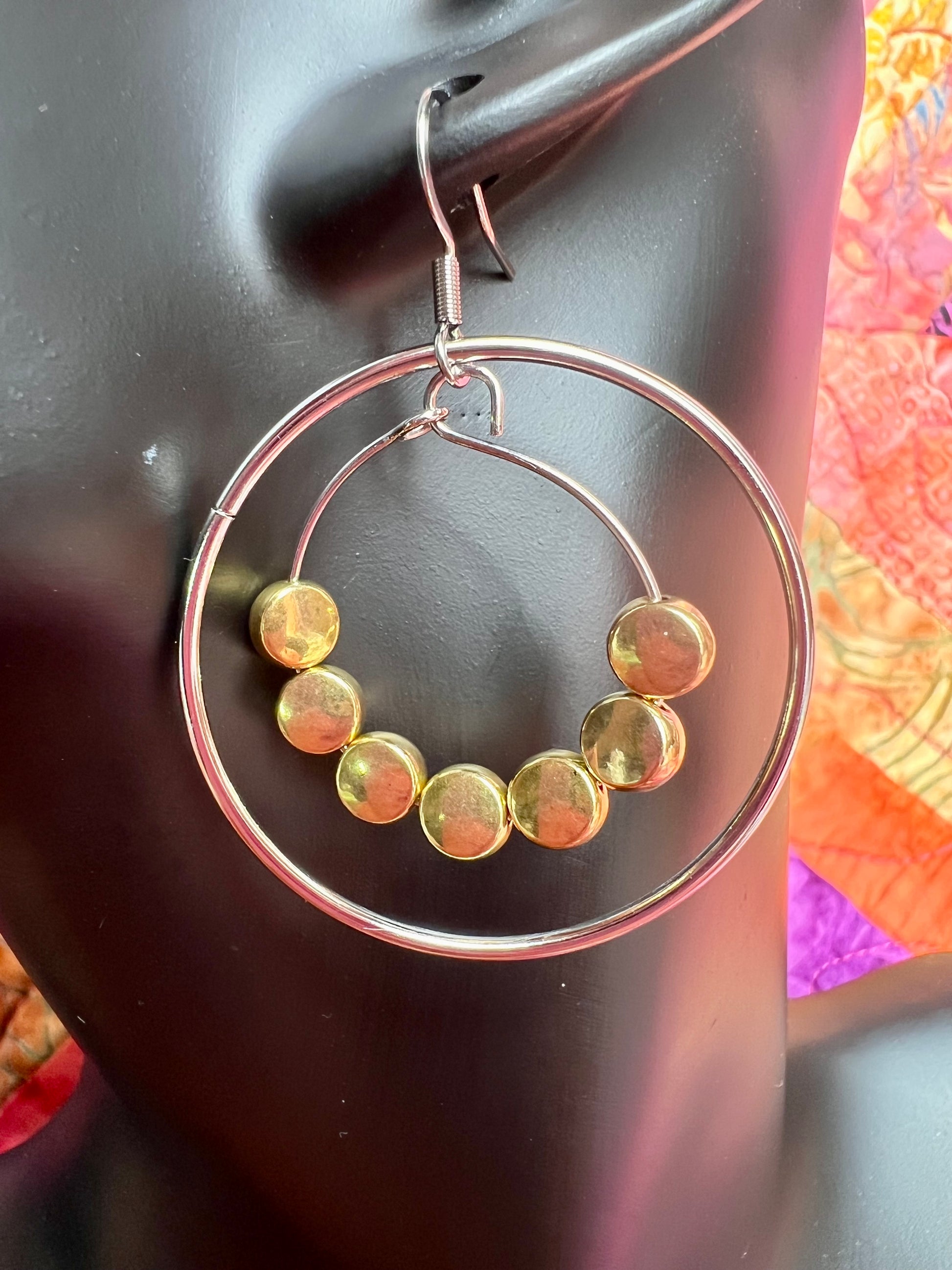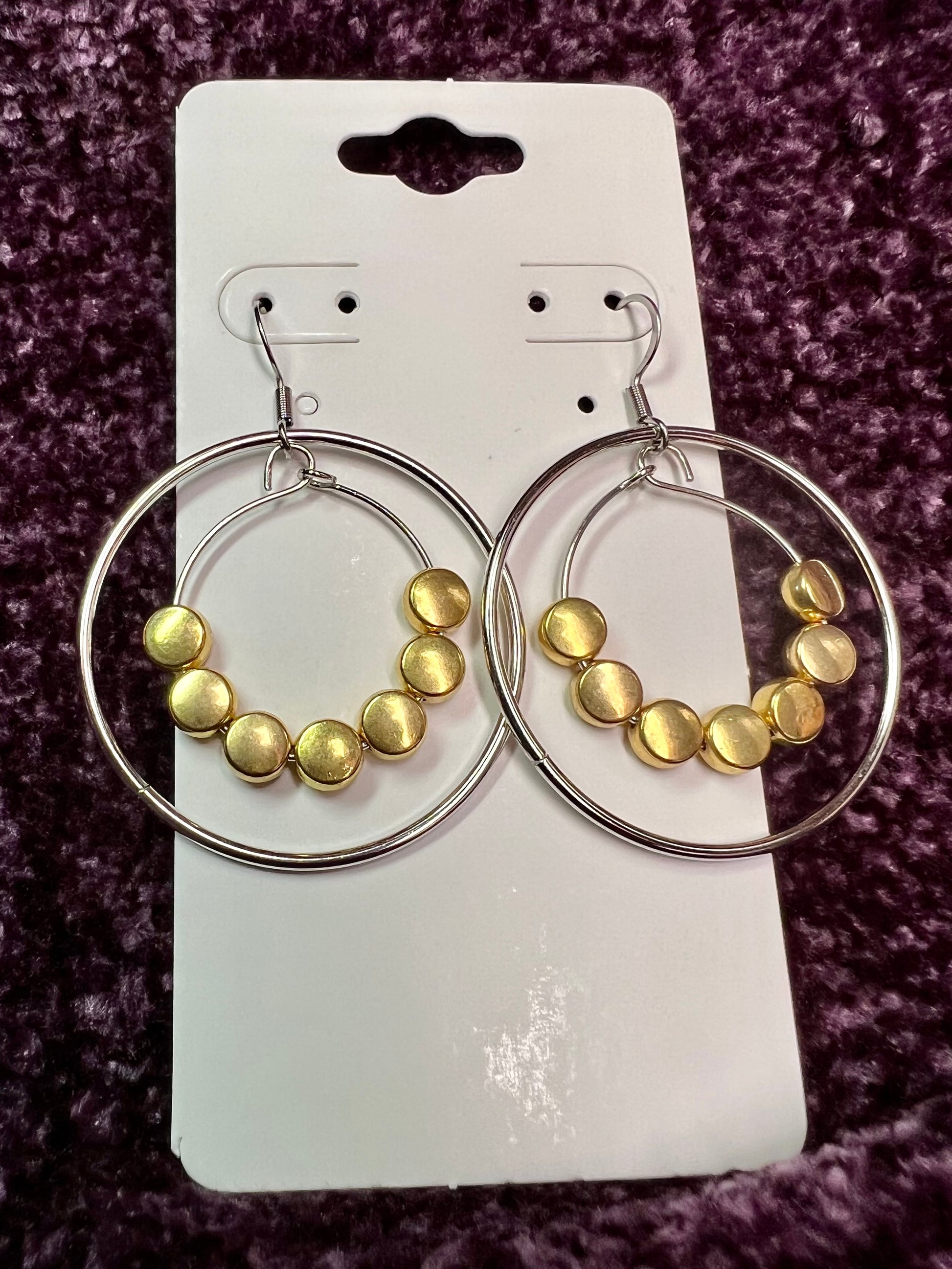 Earrings- Stainless steel ear wires, silver plated metal with gold plated metal coin shaped beads.